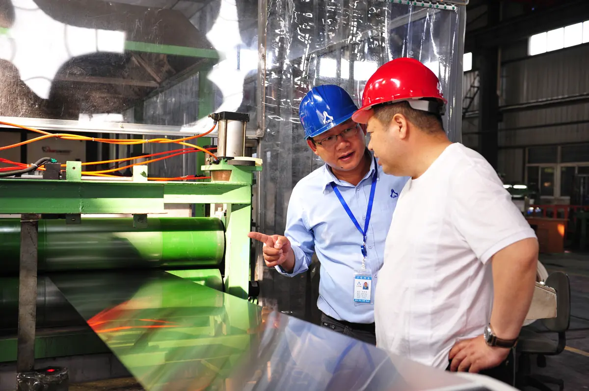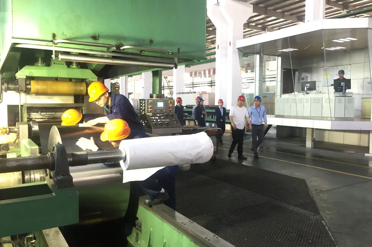 在公司总经理周德勇等的陪同下,金友华董事长一行先后参观了精密冷轧不锈钢生产线、耐指纹车间、磨砂车间、原料库区、成品库区等生产现场,随后在贵宾室双方就进一步加强业务合作,拓宽合作领域,实现共赢发展等共同关心的话题进行了亲切交流。